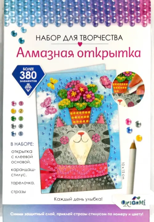 Открытка с очаровательным котиком в формате "укрась и подари" подарит радость и веселье самым близким! Страз в комплекте оживят красочную иллюстрацию ярким блеском. Творчество-антистресс поможет расслабиться и забыть о повседневных заботах. Процесс создания позволит улучшить мелкую моторику рук и станет интересным хобби для взрослых и детей. Уютный подарок и медитация 2в1!
