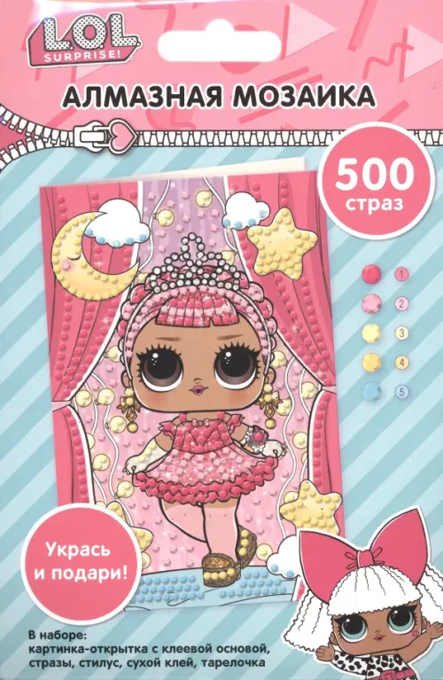В комплекте: картинка 10х15 см (1 шт), стразы (500 шт, 5 цветов), тарелочка, стилус, сухой клей