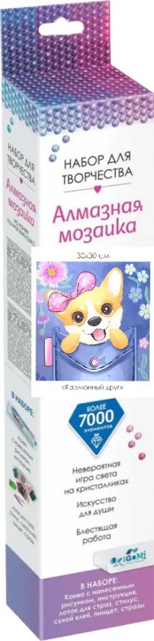 В наборе: канва с нанесенным рисунком, инструкция, лоток для страз, стилус, сухой клей, пинцет, стразы.