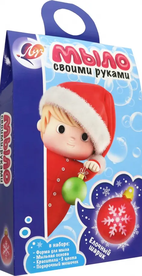 В состав набора входит: мыльная основа 100 гр., пищевые красители 3 цвета в тубах по 5мл., многоразовая форма для мыла, нарядный подарочный мешочек для упаковки готового мыла, пошаговая инструкция указана на упаковке. Упаковка - сумочка из картона.