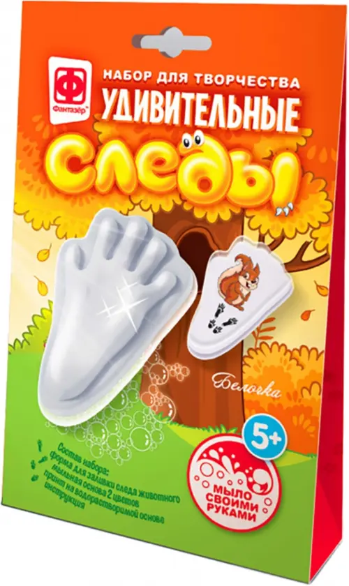 С набором Удивительные следы процесс изучения следов будет необычным, увлекательным, а главное чистым экспериментом, потому что следы животных мы будем делать из мыла, - в наборе для этого уже все есть. Мыло получается в форме 3D следа с одной стороны и картинкой животного, которому принадлежит след, с другой. Такое необычное мыло интересно подержать в руках, рассмотреть и легко запомнить, к тому же внутри вы найдете интересные факты о животных!