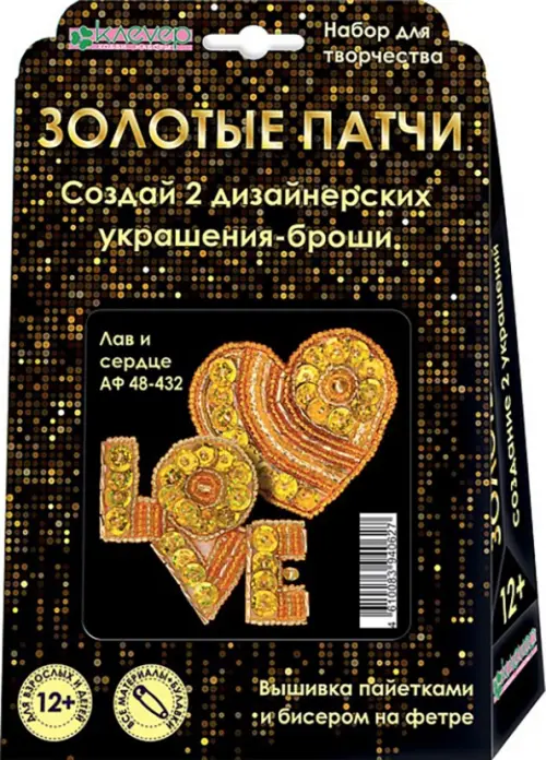 Золотые патчи - трендовые броши-украшения. Рукодельница старше 12 лет легко нашьёт нити с блестящим бисером на фетр, добавит яркие пайетки и золотой стеклярус для акцентов, вырежет изделие по контуру, пришьёт на оборот английскую булавку - и золотая брошь готова! Результатом увлекательного творчества станет золотое чудо - сверкающие сердце и признание «love». Патчи можно носить вместе и по отдельности.
