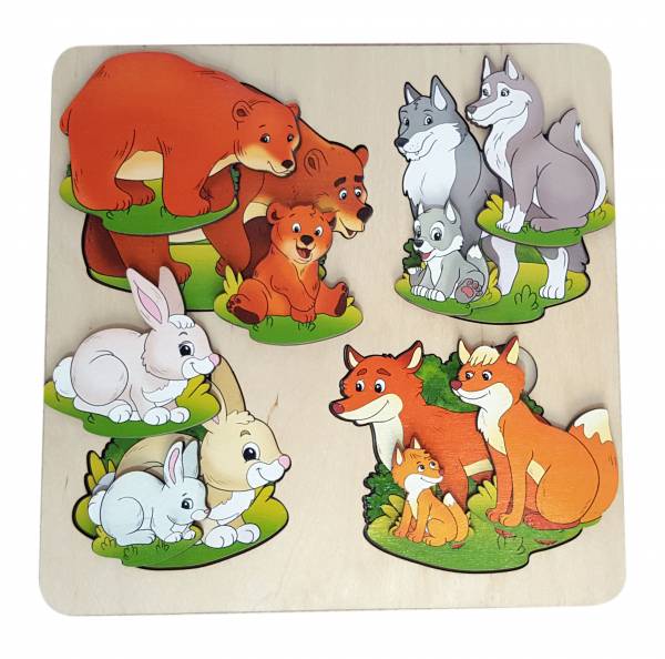 Деревянная доска "Дикие животные" - это игровая панель для развития зрительного восприятия, тактильных функций, мелкой моторики, логического и пространственного мышления Вашего малыша. С ее помощью в увлекательной форме Вы легко сможете познакомить ребенка с дикими животными и понятиями "большой-средний-маленький". Разложите животных на столе, назовите их, вместе найдите животных одного вида. Попросите малыша выбрать всех одинаковых животных, передать Вам все большие, все средние, все маленькие, по очереди разложить одинаковых животных по размеру от большего к меньшему и наоборот, спрятать маленького животного под большим и т.д. Покажите малышу, как нужно вставлять вкладыши в ячейки, предложите сделать это самостоятельно.