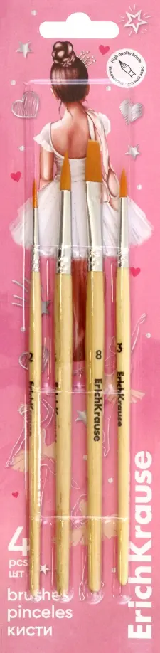 Кисти ErichKrause для рисования акварельными красками и гуашью изготовлены из синтетики. Рабочая часть кисти покрыта гуммирующим составом, защищающим ее при хранении и транспортировке. Ручка изготовлена из натурального дерева и покрыта защитным лаком. Цельнометаллическая бесшовная обойма из алюминия устойчива к коррозии. Круглые 2, 3, 5, плоская - 8.