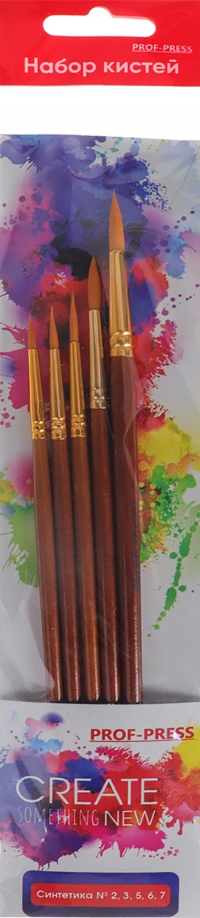 Художественные кисти из синтетики используются для детского и юношеского творчества, для работы с красками на основе масла, акрила, гуаши. Синтетический волос равномерно наполняется краской, а краска равномерно наносится на любую поверхность. Набор включает в себя 5 штук различных размеров (№2, №3, №5, №6, №7). Каждая кисть оснащена деревянной ручкой.