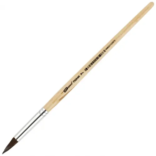 Художественные кисти ArtSpace изготовлены из волоса пони. Он несколько толще, чем у белки, расстояние между волосками больше, поэтому воду такая кисточка набирает меньше, чем из белки или колонка. Приобретают форму конуса, не слишком упруги. Кисть круглой формы с короткой ручкой из дерева идеальна для начинающих художников, поэтому её часто используют в детских образовательных учреждениях.