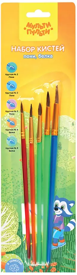 Набор кистей для рисования «Мульти-Пульти» предназначен для детей с начальным и средним уровнем подготовки. В набор входят 5 круглых кистей: 3 из волоса пони штуки № 2, 3, 5 и 2 штуки из волоса белки № 6, 8.