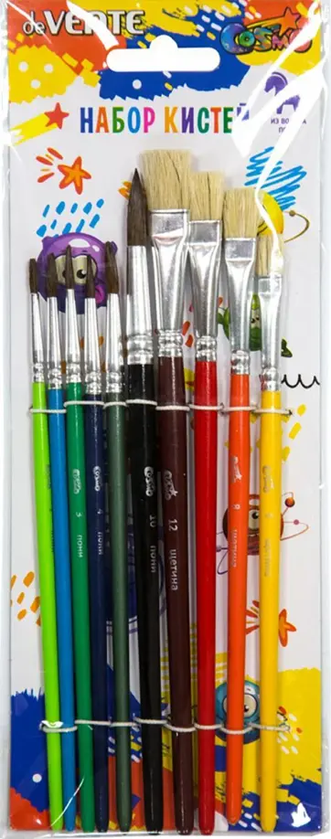 Набор кистей "deVENTE. Cosmo" 10 шт (пони круглые № 1, 2, 3, 4, 6, 10, щетина плоские № 6, 8, 10, 12) ручка деревянная, в пластиковой упаковке с картонной подложкой и резинками-фиксаторами кистей