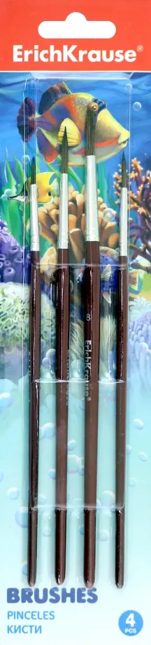 Кисти ErichKrause® для рисования акварельными красками и гуашью. Рабочая часть кисти покрыта гуммирующим составом, защищающим ее при хранении и транспортировке. Ручка изготовлена из натурального дерева и покрыта защитным лаком. Цельнометаллическая бесшовная обойма из алюминия устойчива к коррозии. Круглые 2, 4, 6, 8