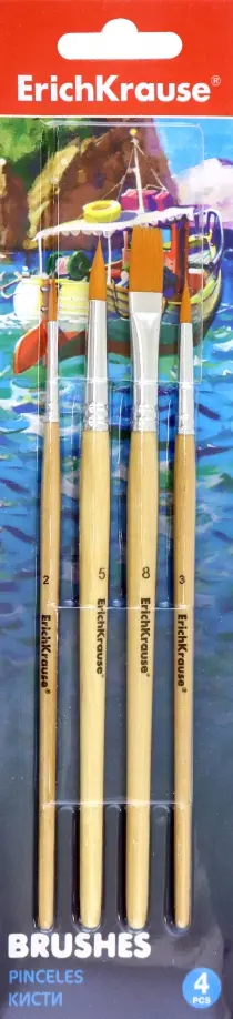 Кисти ErichKrause® для рисования акварельными красками и гуашью. Рабочая часть кисти покрыта гуммирующим составом, защищающим ее при хранении и транспортировке. Ручка изготовлена из натурального дерева и покрыта защитным лаком. Цельнометаллическая бесшовная обойма из алюминия устойчива к коррозии. Круглые 2, 3, 5, плоская - 8.