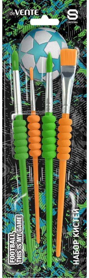 Набор кистей "deVENTE. Football" 4 шт (синтетика круглые № 4, 8, 12, плоская № 10) ручка с эргономичным грипом Soft Touch, окрас волоса, ручки и грипа в ярких зеленом и оранжевом цветах, в картонном блистере