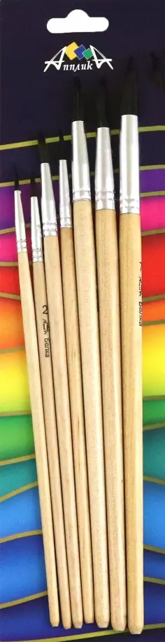 Набор круглых кистей 7 шт. из волоса Белки - № 1, 2, 3, 4, 5, 6, 7. Пучок мягкий и эластичный. Линии получаются плавными и равномерными. Пучок надежно вклеен в металлическую обойму. Обойма закреплена на деревянной ручке с двойным обжатием. Кисти предназначены для рисования акварелью, темперой, гуашью.