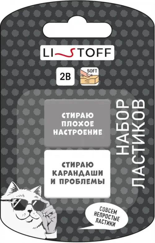 Ластик от Listoff - помощник в устранении ошибок. В наборе 2 штуки, упаковка на европодвесе. Ластики выполнены из ECO-PVC/ термопластичной резины. Не токсичны. На ластике забавные фразы, которые поддержат позитивный настрой. Прекрасно справляются с линиями от чернографитного карандаша, не оставляют следов и грязных разводов после себя. Не деформируют бумагу. Набор поставляется в блистере.