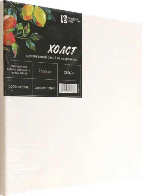 Холст художественный на подрамнике из сосны, белый, Феникс+ арт. 64569/40 ЛИМОНЫ (25х25 см, хлопок 100%, 280г/м2, зерно: среднее, форма: квадратная, грунтованный, для акрила, масла, смешанных техник, ПЭТ-плёнка).
