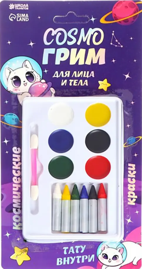 Грим для лица - это декоративная косметика, которая позволит ребёнку мгновенно перевоплотиться в персонажа на свой вкус. А взрослые с его помощью смогут создать неповторимый образ для любого праздничного случая: дня рождения, Хеллоуина, Дня России или тематической вечеринки. В набор входят переводные татуировки для создания уникального и стильного образа. Набор состоит из 6 цветных карандашей и 6 красок для тела.