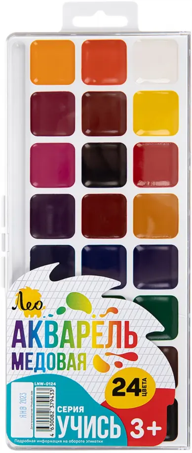 Медовая акварель ТМ Лео серии "Учись" сделает знакомство ребенка с этой непростой техникой приятным, увлекательным и веселым. Прекрасно подходит для занятий рисованием в детском саду, кружках, дома, школе. Акварель разработана с учетом рекомендаций педагогов, безопасна для детей, не токсична. Изготавливается на основе только натуральных компонентов.Медовая акварель ТМ Лео серии "Учись" обладает следующими потребительскими свойствами:- краски легко набираются на кисть без предварительного размачивания,- не дают грязи при смешивании,- прекрасно размываются водой и смешиваются между собой,- чистые, яркие цвета,- быстро высыхают,- легко смываются с рук и отстирываются с одежды,- отличаются прекрасной разносимостью и отлично ложатся на бумагу,- соответствуют международным стандартам безопасности,- срок годности не ограничен.Акварель выпускается в классическом пластиковом пенале с прозрачной крышкой и европодвесом. Пенал функционален и достаточно прочен, обладает компактными размерами. Крышку можно использовать как палитру для смешивания красок, предусмотрено отделение для кисточки. Замок и крепление надежны, пенал выдерживает падения и многократные открывания.(Новый дизайн)