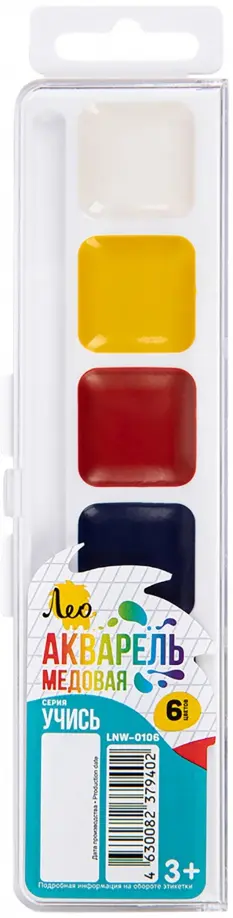 Медовая акварель ТМ Лео серии "Учись" сделает знакомство ребенка с этой непростой техникой приятным, увлекательным и веселым. Прекрасно подходит для занятий рисованием в детском саду, кружках, дома, школе. Акварель разработана с учетом рекомендаций педагогов, безопасна для детей, не токсична. Изготавливается на основе только натуральных компонентов.Медовая акварель ТМ Лео серии "Учись" обладает следующими потребительскими свойствами:- краски легко набираются на кисть без предварительного размачивания,- не дают грязи при смешивании,- прекрасно размываются водой и смешиваются между собой,- чистые, яркие цвета,- быстро высыхают,- легко смываются с рук и отстирываются с одежды,- отличаются прекрасной разносимостью и отлично ложатся на бумагу,- соответствуют международным стандартам безопасности,- срок годности не ограничен.Акварель выпускается в классическом пластиковом пенале с прозрачной крышкой и европодвесом. Пенал функционален и достаточно прочен, обладает компактными размерами. Крышку можно использовать как палитру для смешивания красок, предусмотрено отделение для кисточки. Замок и крепление надежны, пенал выдерживает падения и многократные открывания.(Новый дизайн)