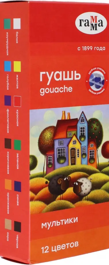 Гуашь серии "Мультики" разработана совместно с педагогами специально для детей школьного возраста от 6 до 9 лет. Краски отличаются высокой плотностью и укрывистостью, легко наносятся на бумагу или картон и быстро высыхают. После высыхания рисунок приобретает матово-бархатистую поверхность. Яркие цвета прекрасно смешиваются между собой, позволяя получать новые красивые и чистые оттенки. Краски Гамма изготовлены на основе натуральных компонентов и высококачественных пигментов. Легко смываются с рук и отстирываются с одежды. Гуашь «Мультики» фасуется в новую удобную упаковку - блок-тару, баночки спаяны между собой и находятся в одной «связке», что позволяет ребенку хранить краски разных цветов вместе, препятствуя их случайному опрокидыванию с рабочей поверхности или рассыпанию по портфелю, а также потере крышечек. Объем одной баночки - 15 мл.