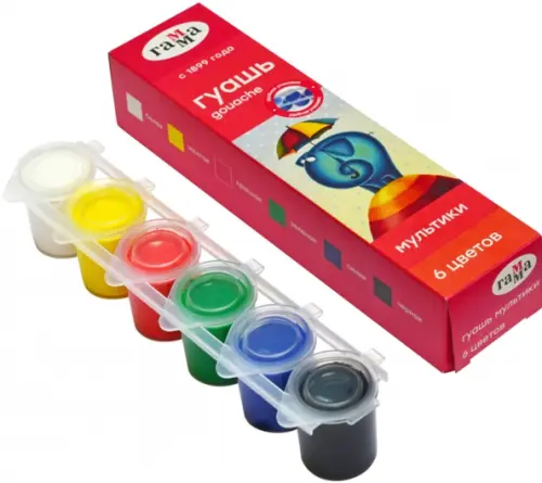 Гуашь серии "Мультики" разработана совместно с педагогами специально для детей школьного возраста от 6 до 9 лет. Краски отличаются высокой плотностью и укрывистостью, легко наносятся на бумагу или картон и быстро высыхают. После высыхания рисунок приобретает матово-бархатистую поверхность. Яркие цвета прекрасно смешиваются между собой, позволяя получать новые красивые и чистые оттенки. Краски Гамма изготовлены на основе натуральных компонентов и высококачественных пигментов. Легко смываются с рук и отстирываются с одежды. Гуашь «Мультики» фасуется в новую удобную упаковку - блок-тару, баночки спаяны между собой и находятся в одной «связке», что позволяет ребенку хранить краски разных цветов вместе, препятствуя их случайному опрокидыванию с рабочей поверхности или рассыпанию по портфелю, а также потере крышечек. Объем одной баночки - 15 мл.