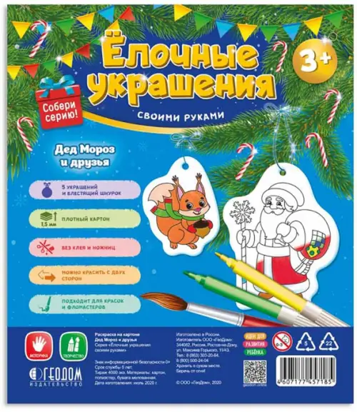 Как красиво смотрятся на ёлке игрушки, сделанные своими руками! Теперь это можно легко и быстро организовать. С нашим набором ребёнок сможет раскрасить уже готовые изображения Деда Мороза, Снегурочки, милых и очаровательных зверей. Нужно просто выдавить двухстороннюю фигурку из основы, раскрасить и привязать яркий праздничных шнурок. И всё! Игрушка на ёлку готова! В набор входит 5 замечательных фигурок и блестящий шнурок. Раскрашивать можно и фломастерами, и красками.