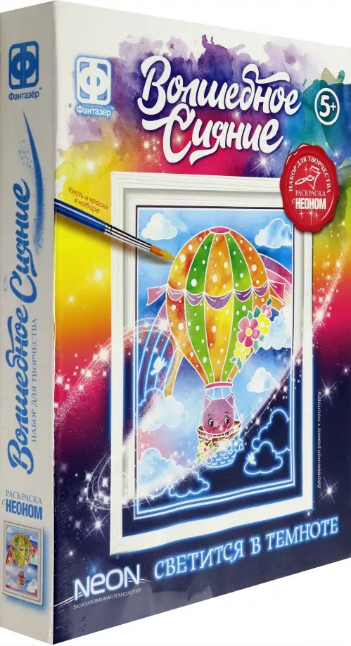 В наборе: бумага с нанесенным неоновым контуром, краски акварельные, кисточка, краска акриловая для рамки, бумажное паспарту, деревянная рамка.