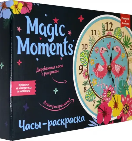 Если продуктивное творчество вам по душе, то часы-раскраска станут для вас настоящей находкой! В наборе вы найдете красивую деревянную заготовку с контурным рисунком. Ее можно раскрасить, скопировав дизайн с упаковки. Для этого просто следуйте пошаговой схеме раскрашивания на коробке. Либо создайте авторский рисунок! Палитра красок и кисточка уже идут в комплекте. Теперь закрепите стрелки и часовой механизм и ваш сувенир готов!