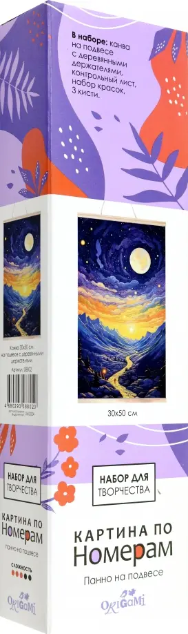 В наборе: холст с нанесенным контурным рисунком, 3 кисточки, акриловые краски, контрольный лист