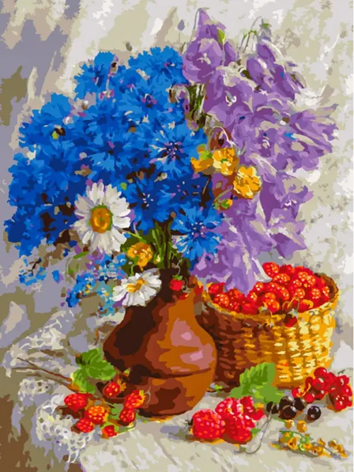 Цветочный сюжет разработан по мотивам картины Екатерины Калиновской. Нарисуйте цветочную композицию на хлопковом холсте. Яркие акриловые краски расфасованы по маленьким баночкам, каждой из которой присвоен номер, соответствующий номеру на схеме холста. Кисточками разного размера вы сможете закрасить каждый участок вашей картины.