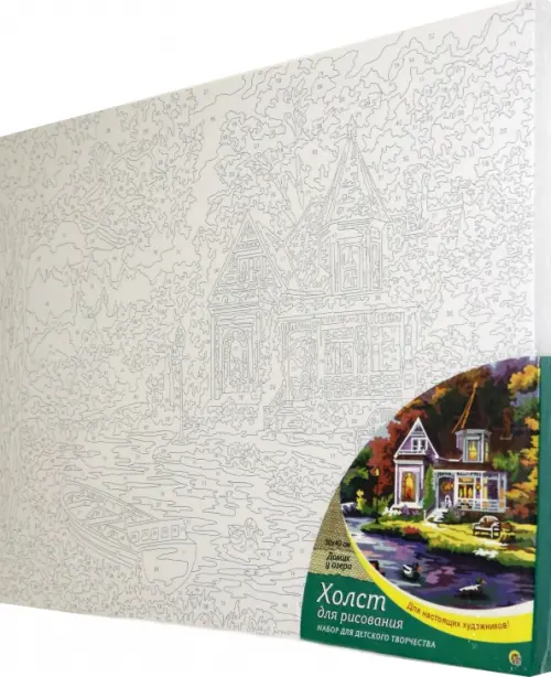 Холст с красками. Домик у озера