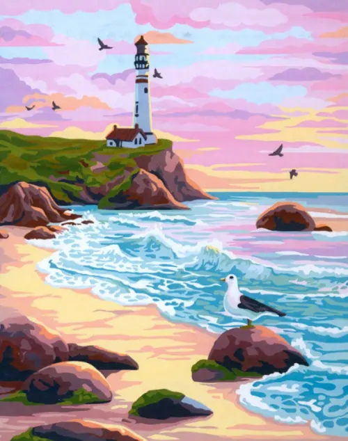 Картина по номерам на холсте с подрамником «Маяк на закате» 40х50 см понравится и детям, и взрослым.
