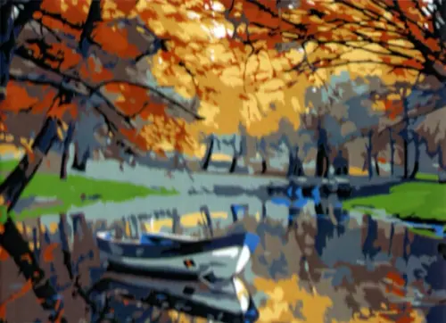 Холст с красками. Осенний парк с прудом