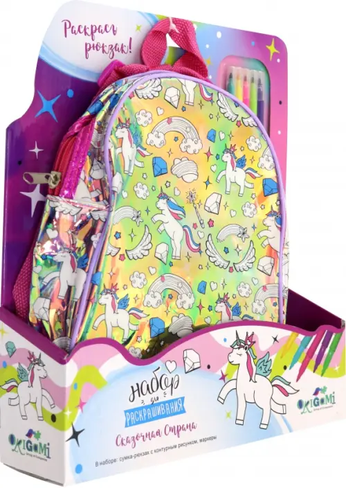 В наборе: сумка-рюкзак с контурным рисунком, маркеры.