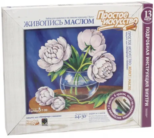 В наборе: холст на подрамнике, 3 кисти, набор из 6 красок и пошаговая инструкция. Размер холста: 24х30 см.