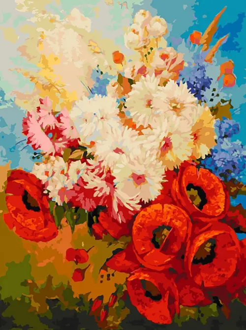 Основа картины - хлопковый холст, натянутый на деревянный подрамник. На холст нанесена схема, разделенная на области для закрашивания. Цифра внутри каждой области указывает на номер краски, которой необходимо закрасить данный участок. В комплект входят акриловые краски на водной основе, экологически безопасные, без запаха, быстросохнущие. Картина раскрашивается без смешивания красок. Набор рисования комплектуется специальными кистями разного размера с искусственным ворсом для акриловых красок.