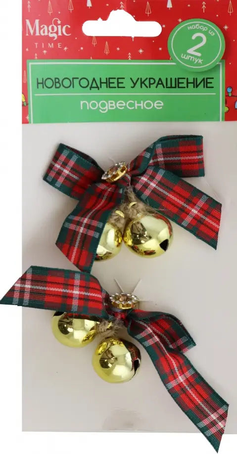 Новогодние золотые бубенчики в виде подвесного украшения прекрасно дополнят собой праздничный интерьер или новогоднюю елку и просто будет радовать окружающих. Своим универсальным дизайном украшение локанично подчеркнет убранство дома, подарит ощущение сказки и волшебства. Изделие выполнено из металла, отделано лентой из полиэстра. В наборе 2 штуки.