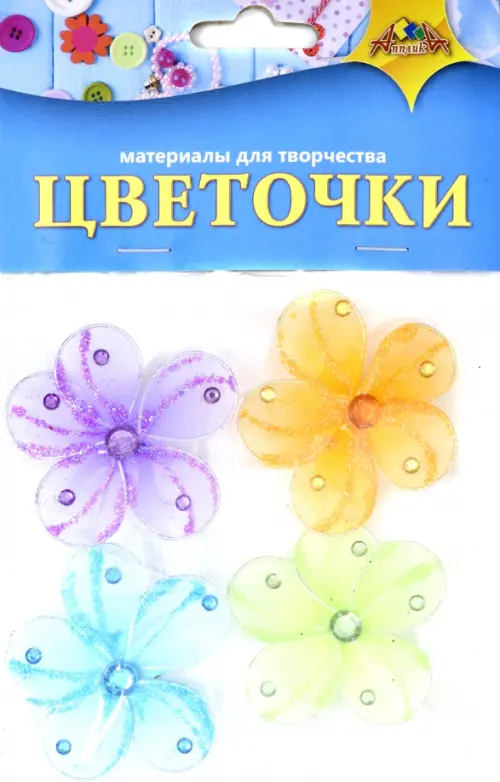 Набор для творчества. Цветочки. В наборе 4 цветка, которые сделаны из проволоки и органзы, украшены блестками и стразами. Цветочки имеют двусторонний объемный скотч. Упакованы в ПЭТ-пакет с картонным европодвесом.