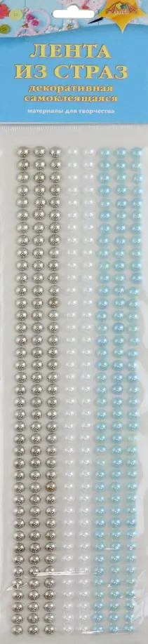 Набор для творчества. Декоративные самоклеящиеся ленты из страз». Цветные стразы из акрила разной формы выложены в виде ленты, на обратную сторону которой нанесен клей. Лента имеет ширину 15-20 мм и длину 275 мм. В зависимости от размеров и формы кристалл