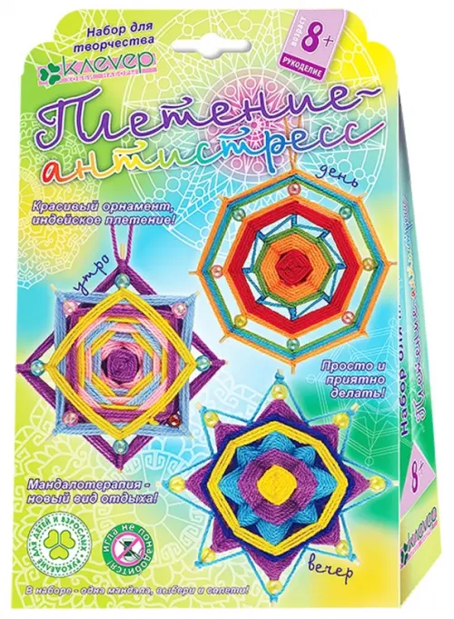 С набором для творчества "Плетение-антистресс" от производителя "Клевер" можно создать своими руками такое оригинальное украшение для дома, как "Мандала - День". Из акриловых ниток, бусинок и деревянных палочек, входящих в комплект, получается красивая плетеная звезда - символ дня. А несложный процесс изготовления доставит удовольствие мастерице и вдохновит на новые творческие успехи.