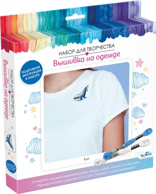 Набор для творчества. Вышивка на одежде - «Кит» это готовый комплект для создания уникальных дизайнов на одежде. В набор входят пяльцы, водорастворимая канва с нанесенным контуром рисунка, нитки мулине, иголка, инструкция по созданию дизайнов. Вышивка гладью - это техника, при которой нитки проходят сквозь ткань и создают рисунок, который можно использовать для украшения одежды, сумок, шарфов и других аксессуаров. Набор для творчества подходит как для начинающих, так и для опытных мастеров, которые хотят создать оригинальные и уникальные вещи. В процессе вышивания вы получите не только красивые вещи, но и удовольствие от процесса творчества.