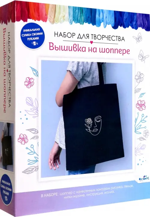 В наборе: пяльцы ,сумка-шоппер с нанесенным рисунком, нитки, игла, инструкция.