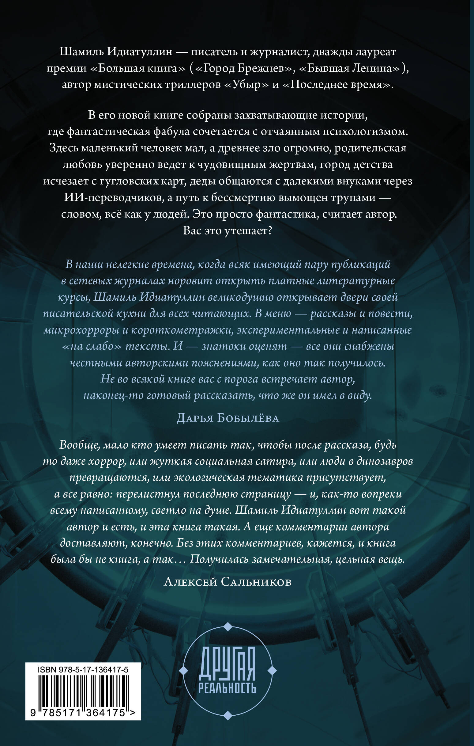 Шамиль Идиатуллин - писатель и журналист, дважды лауреат премии "Большая книга" ("Город Брежнев", "Бывшая Ленина"), автор мистических триллеров "Убыр" и "Последнее время". В его новой книге собраны захватывающие истории, где фантастическая фабула сочетается с отчаянным психологизмом. Здесь маленький человек мал, а древнее зло огромно, родительская любовь уверенно ведет к чудовищным жертвам, город детства исчезает с гугловских карт, деды общаются с далекими внуками через ИИ-переводчиков, а путь к бессмертию вымощен трупами - словом, всё как у людей. Это просто фантастика, считает автор. Вас это утешает? В наши нелегкие времена, когда всяк имеющий пару публикаций в сетевых журналах норовит открыть платные литературные курсы, Шамиль Идиатуллин великодушно открывает двери своей писательской кухни для всех читающих. В меню - рассказы и повести, микрохорроры и короткометражки, экспериментальные и написанные "на слабо" тексты. И - знатоки оценят - все они снабжены честными авторскими пояснениями, как оно так получилось. Не во всякой книге вас с порога встречает автор, наконец-то готовый рассказать, что же он имел в виду. (Дарья Бобылёва) Вообще, мало кто умеет писать так, чтобы после рассказа, будь то даже хоррор, или жуткая социальная сатира, или люди в динозавров превращаются, или экологическая тематика присутствует, а все равно: перелистнул последнюю страницу - и, как-то вопреки всему написанному, светло на душе. Шамиль Идиатуллин вот такой автор и есть, и эта книга такая. А еще комментарии автора доставляют, конечно. Без этих комментариев, кажется, и книга была бы не книга, а так… Получилась замечательная, цельная вещь. (Алексей Сальников)| Издательство | ИЗДАТЕЛЬСТВО "АСТ" |