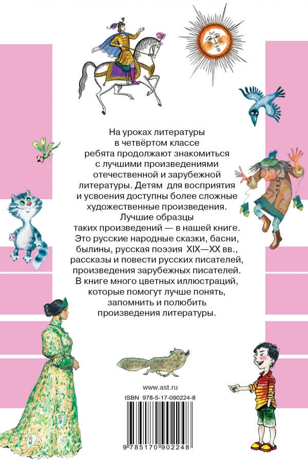 В книгу вошли произведения классиков отечественной и зарубежной литературы, включённые в школьную программу по литературе для четвёртого класса. Это русские народные сказки, басни, былины, стихи русских поэтов XIX и XX веков, повести русских писателей, произведения зарубежных писателей. Цветные иллюстрации в книге лучших художников. Книга адресована детям младшего школьного возраста.
