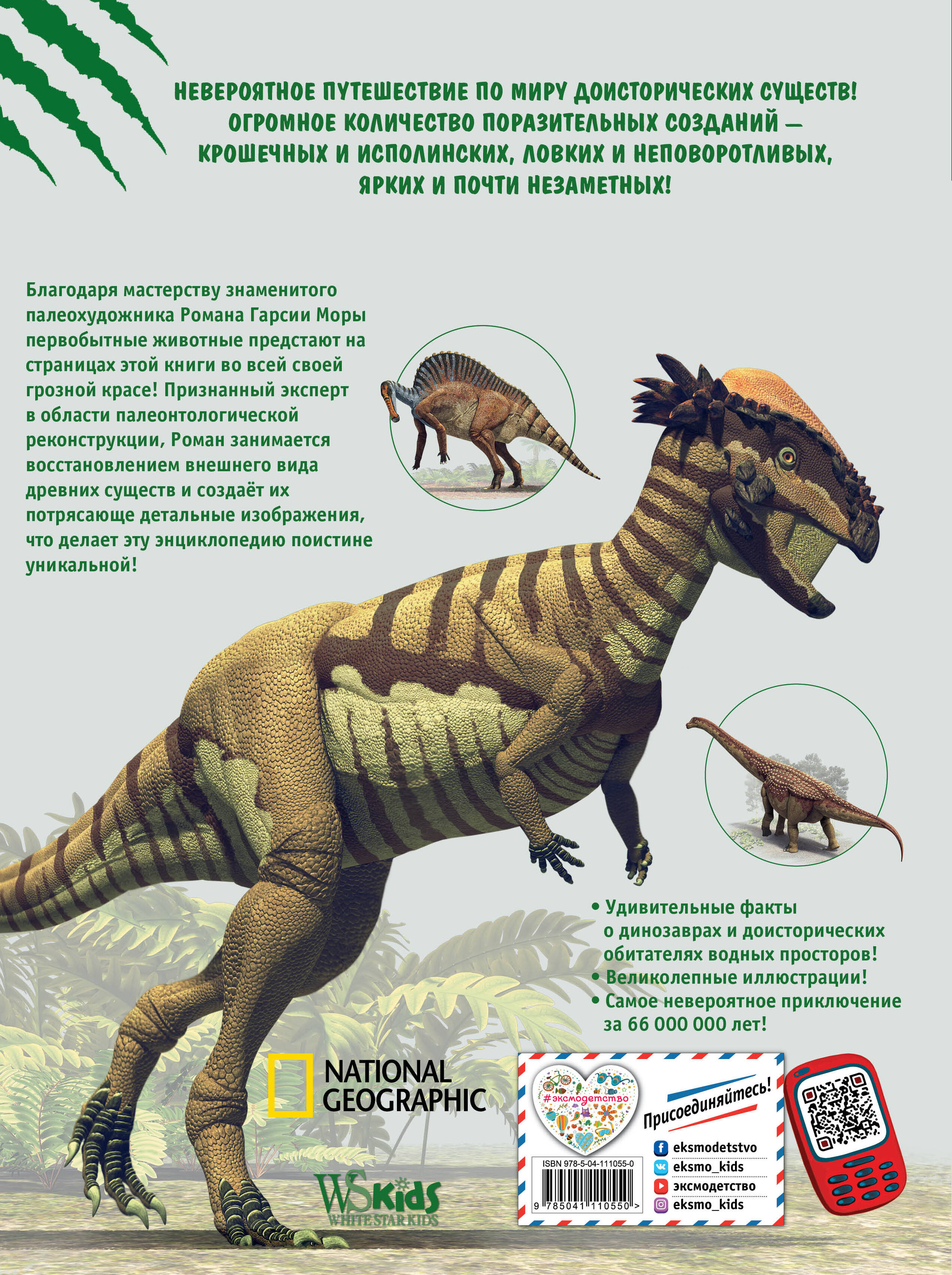 Эта энциклопедия содержит ответы на самые невообразимые вопросы о популярнейших динозаврах и первобытных обитателях водных просторов! Какого ящера прозвали «ужасным когтем» и почему? Кто из динозавров любил бодаться с сородичами? Какой древний «вегетарианец» весил больше стада слонов? Правда ли, что лох-несское чудовище на деле является плезиозавром? Читатели получат ответы на все эти и многие другие вопросы о доисторических существах, а благодаря потрясающе детальным изображениям знаменитого палеохудожника Романа Гарсии Моры переживут самое невероятное приключение! Издание предназначено для детей среднего школьного возраста. • Популярнейшие динозавры и первобытные обитатели водных просторов в одной энциклопедии! • Потрясающе детальные иллюстрации от легендарного палеохудожника Романа Гарсии Моры! • Удивительные факты для юных палеонтологов! • Лёгкий и доступный язык! • Самое невероятное приключение за 66 000 000 лет!