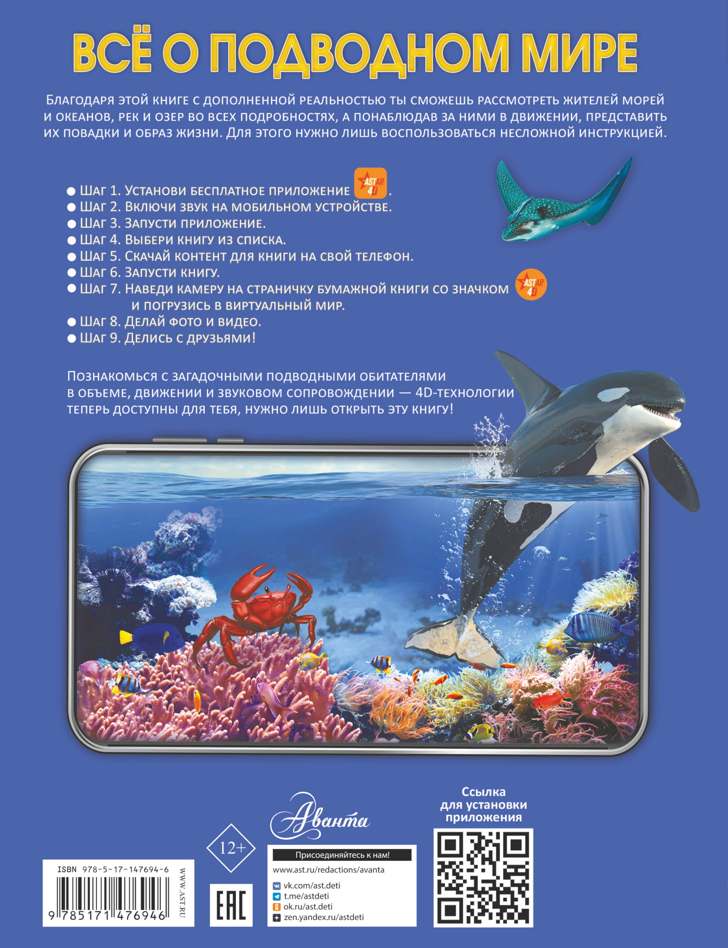 Все ребята, интересующиеся обитателями подводного мира, наверняка были бы рады не просто прочитать о них очередную книгу, а рассмотреть морских жителей со всех сторон, увидеть своими глазами, как плавает, открывая пасть, косатка в поисках добычи и несется, рассекая водную гладь, стремительный парусник, как сражается за раковину рак-отшельник и как передвигается, сокращая зонтик, медуза. И теперь такая возможность есть! Ведь перед тобой книга с дополненной реальностью, а это значит, что ты познакомишься с самыми разными подводными обитателями в объеме, движении и звуковом сопровождении. У каких рыбок икринки вынашивает самец? Для чего тысячи черепах собираются вместе на одном пляже? Как отличить пилоносую акулу от пилорылого ската? Какой моллюск считается самым ядовитым животным на Земле? Какие подводные обитатели могут прожить до 200 лет, не старея? Какие рыбы способны пролетать над водой сотни метров? Как нерпы обманывают белых медведей? На эти и многие другие вопросы ты найдешь ответы в настоящем издании, посвященном жителям подводного царства. Для среднего и старшего школьного возраста.| Издательство | АСТ |