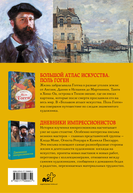 Комплект состоит из 2-х книг, посвященных самым ярким явлениям французской живописи - имперссионизму и посимпрессионизму. Новаторство и идеи этих направлений полностью изменили художественное восприятие искусства XIX и XX века. История изучения импрессионизма насчитывает уже не одно столетие. Книга " Архивы импрессионизма", изданная в 1939 году известным итальянским искусствоведом Лионелло Вентури, является сборником ценнейших документов - писем художников-импрессионистов, адресованных Полю Дюран-Рюэлю - их постоянному маршану и покровителю, чья биография тоже включена в книгу. Наиболее многочисленны письма главных представителей группы - Клода Моне, Огюста Ренуара и Камиля Писсарро. Жизнь забрасывала Гогена в разные уголки земли: от Англии, Дании и Испании до Мартиники, Таити и Хива-Оа, острова в Тихом океане, где он писал картины, которые после смерти прославили его на весь мир. В "Большом атласе Гогена" мы совершим путешествие по следам знаменитого художника.| Издательство | ИЗДАТЕЛЬСТВО "АСТ" |