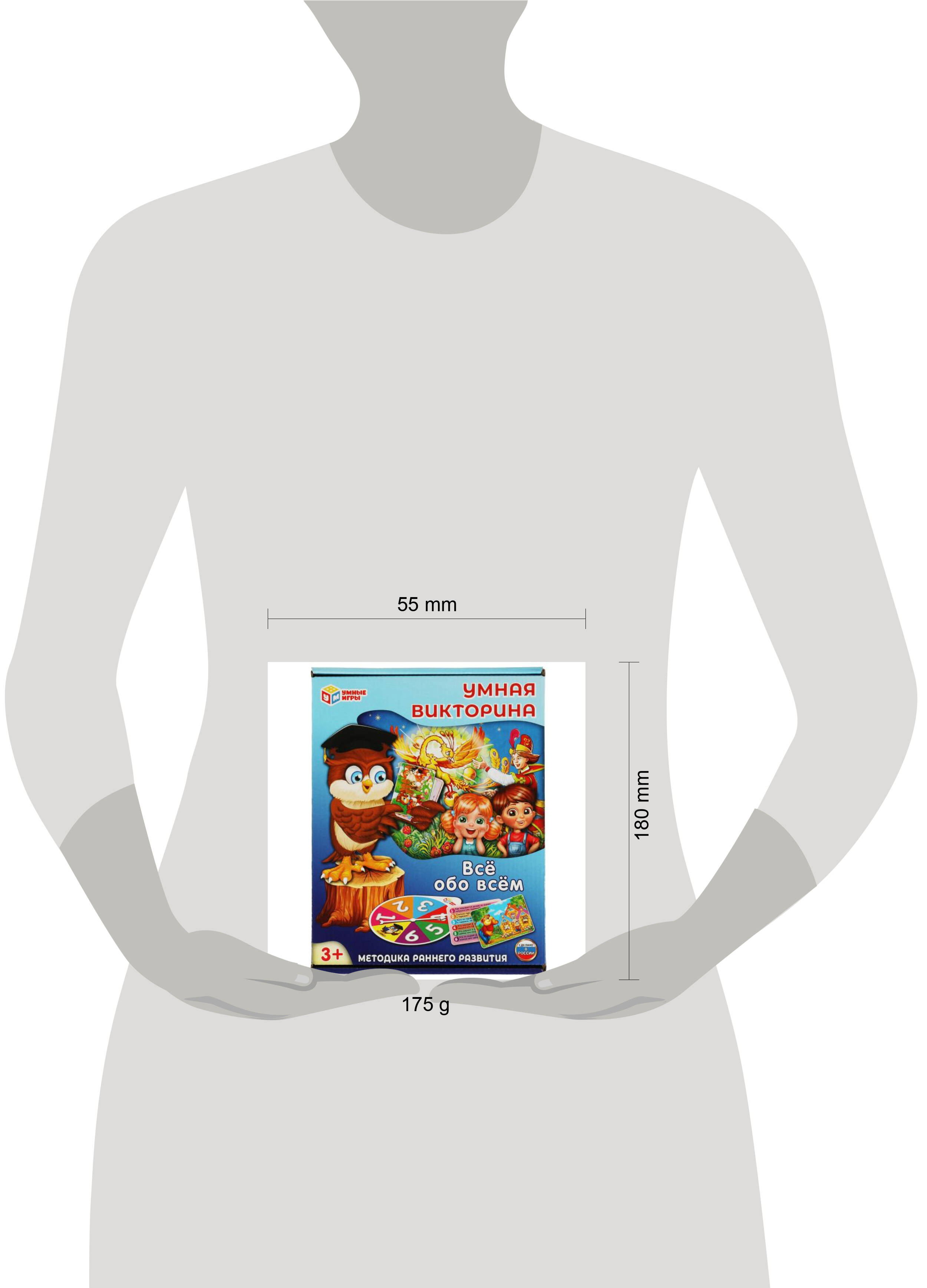 Умная викторина "Всё обо всём" ТМ "Умные игры" - увлекательное обучение в игровом формате по методике раннего развития. Состав игры: - 32 карточки с вопросами - рулетка - правила игры Данная викторина имеет три уровня сложности и предназначена как для индивидуальной игры, так и для игры в компании. Игра должна проходить при непосредственном участии взрослого. 1. Начальный уровень (3+) Предложите ребёнку взять карточку из колоды и рассмотрите изображение на ней вместе с ребёнком. Попросите малыша рассказать, что он видит на картинке. Попробуйте вместе найти ответы на все вопросы с обратной стороны карточки. Для удобства перед началом игры вы можете разделить карточки на категории (каждой категории соответствует определённый цвет). 2. Базовый уровень (4+) Разделите колоду карт на четыре категории. Выберите тему, по которой будет проходить игра. Изображение на каждой карточке поможет ответить на поставленный вопрос. Также для ответа, например, по теме "Сказки" необходимо перед началом игры прочитать с малышом соответствующие произведения. Карточки же из категории "Природа" можно взять с собой на прогулку и внимательно понаблюдать за окружающим миром. Ход игры. Игрок берёт карточку из колоды и крутит стрелку рулетки. Далее взрослому необходимо прочитать вопрос, соответствующий цифре, выпавшей на рулетке. Если стрелка выпала на сектор с совой, игрок может ответить на любой вопрос карточки (в этом случае ребёнку даётся три попытки на правильный ответ). После заданного вопроса игрок рассматривает картинку и ищет ответ на вопрос. При правильном ответе игрок в качестве приза получает карточку. Если же он ответил неверно, карточку необходимо положить обратно в середину колоды. При командной игре ход переходит следующему игроку. Побеждает тот, кто первым наберёт заранее обговоренное число карт (4, 8, 16). 3. Высокий уровень (5+) При игре на высоком уровне карты не разделяются на категории и игроку необходимо быстро ориентироваться сразу в нескольких темах викторины. Игрок берёт карту из колоды, внимательно рассматривает изображение и запоминает его. Далее он переворачивает карту и крутит стрелку рулетки. Не рассматривая изображение, он должен ответить на выпавший вопрос по памяти. При правильном ответе игрок в качестве приза получает карточку. Если же он ответил неверно, карточку необходимо положить обратно в середину колоды. При командной игре ход переходит следующему игроку. Побеждает тот, кто первым наберёт заранее обговоренное число карт (4, 8, 16). Викторина ТМ "Умные игры" расширяет кругозор и развивает: - внимание - мышление - логику - коммуникативные навыки - память Размер упаковки: 240 x 180 x 55 мм. Материал: картон + пластмасса. Рекомендовано детям от 3-х лет.| Издательство | С-Маркет ООО |