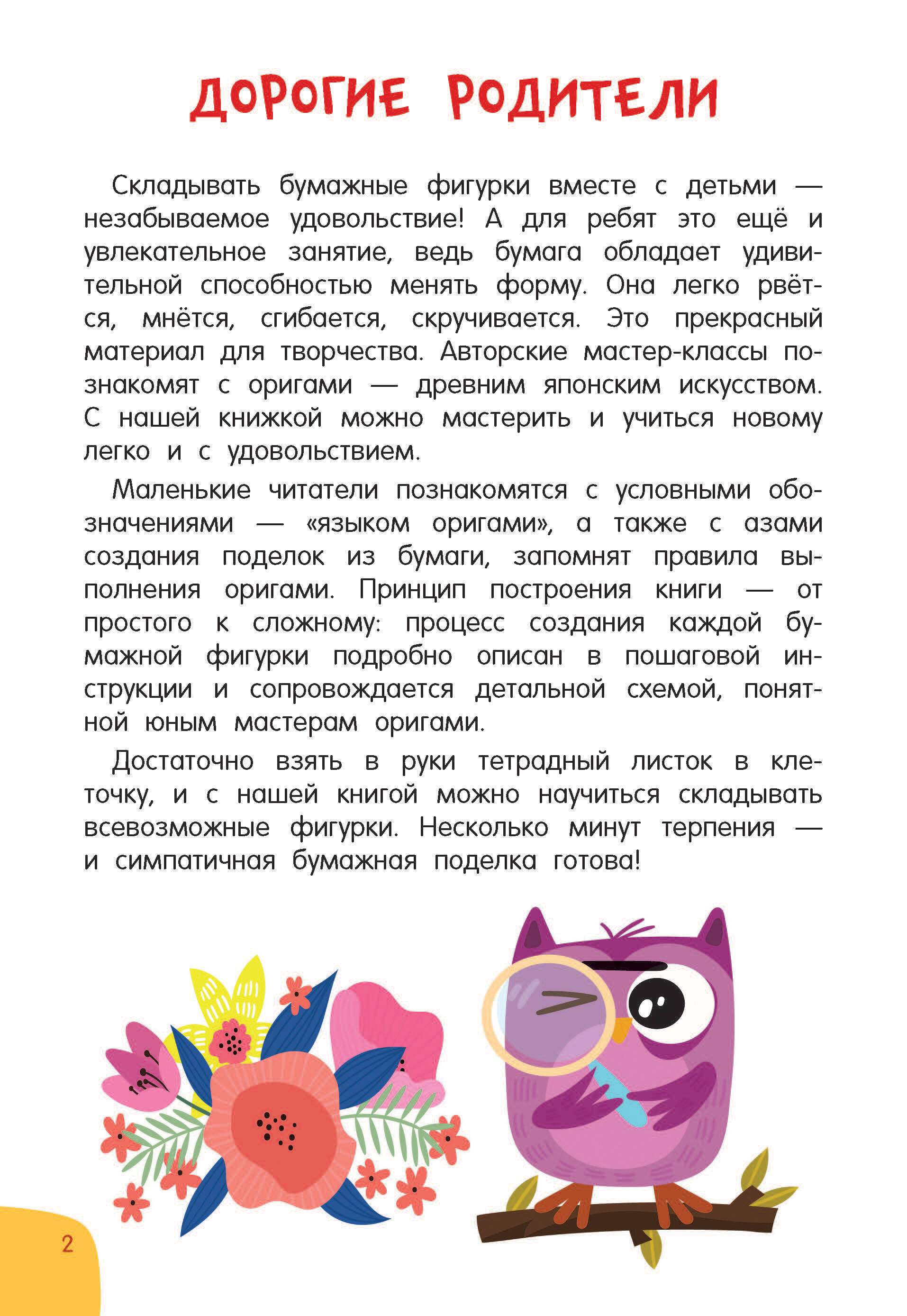Бумага превращается - в необычные поделки и уникальные подарки для родных и друзей! Весь процесс создания оригами - в картинках, абсолютно понятен, удобные странички на спирали. Коллекция авторских пошаговых мастер-классов - детально и наглядно. Полное руководство оригами с подробными условными обозначениями. Интересная игра + развитие внимания, памяти, логики, воображения, мелкой моторики. Книжка-мастерилка - источник творческих идей для тех ребят, которым нравится своими руками создавать потрясающий бумажный мир. Складывать оригами не только весело и интересно, но и очень полезно для творческого и интеллектуального развития. Игры с бумагой готовят руку к письму и развивают геометрическое мышление, ловкость рук, усидчивость, учат сосредотачиваться и удерживать внимание, помогают ориентироваться в пространстве, закрепляют навыки счёта, учат работать по инструкции, вырабатывают усидчивость, тренируют произвольное внимание, помогают ребенку раскрыть свой внутренний мир, учат самовыражению.