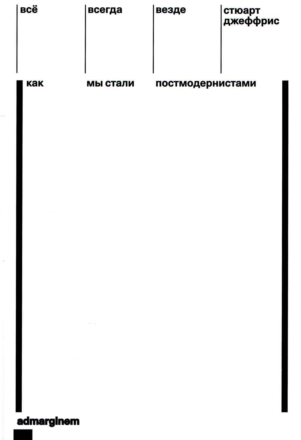 Стюарт Джеффрис (род. 1962), британский публицист, колумнист Guardian, автор нескольких книг, на сей раз предлагает читателям панорамный или, скорее, калейдоскопичный обзор полувековой на сегодняшний день истории постмодерн(изм)а - то ли культурной парадигмы, то ли стиля, то ли состояния, спутавшего карты приверженцам линейных исторических нарративов и смешавшего, кажется, всё и вся: высокое и низкое, старое и новое, правду и вымысел, искусство и поп-культуру и т. д. Среди героев книги - философы, политики, художники, стартаперы, кинорежиссеры, архитекторы, музыканты и активисты, представители всех сфер культурного (и только ли?) производства, внесшие свой вклад в «великое стирание границ», которое поставило под вопрос всякие иерархии (вместо них теперь - всё), временные рубежи (всё теперь всегда) и собственно границы (всё - везде). Джеффрис, в свою очередь, постмодернистски ставит под вопрос сам постмодернизм, показывая, что заложенный в него неолиберальным капитализмом эмансипаторный заряд не сработал, но в то же время признает, что коль скоро мы стали постмодернистами, у нас нет пути назад.