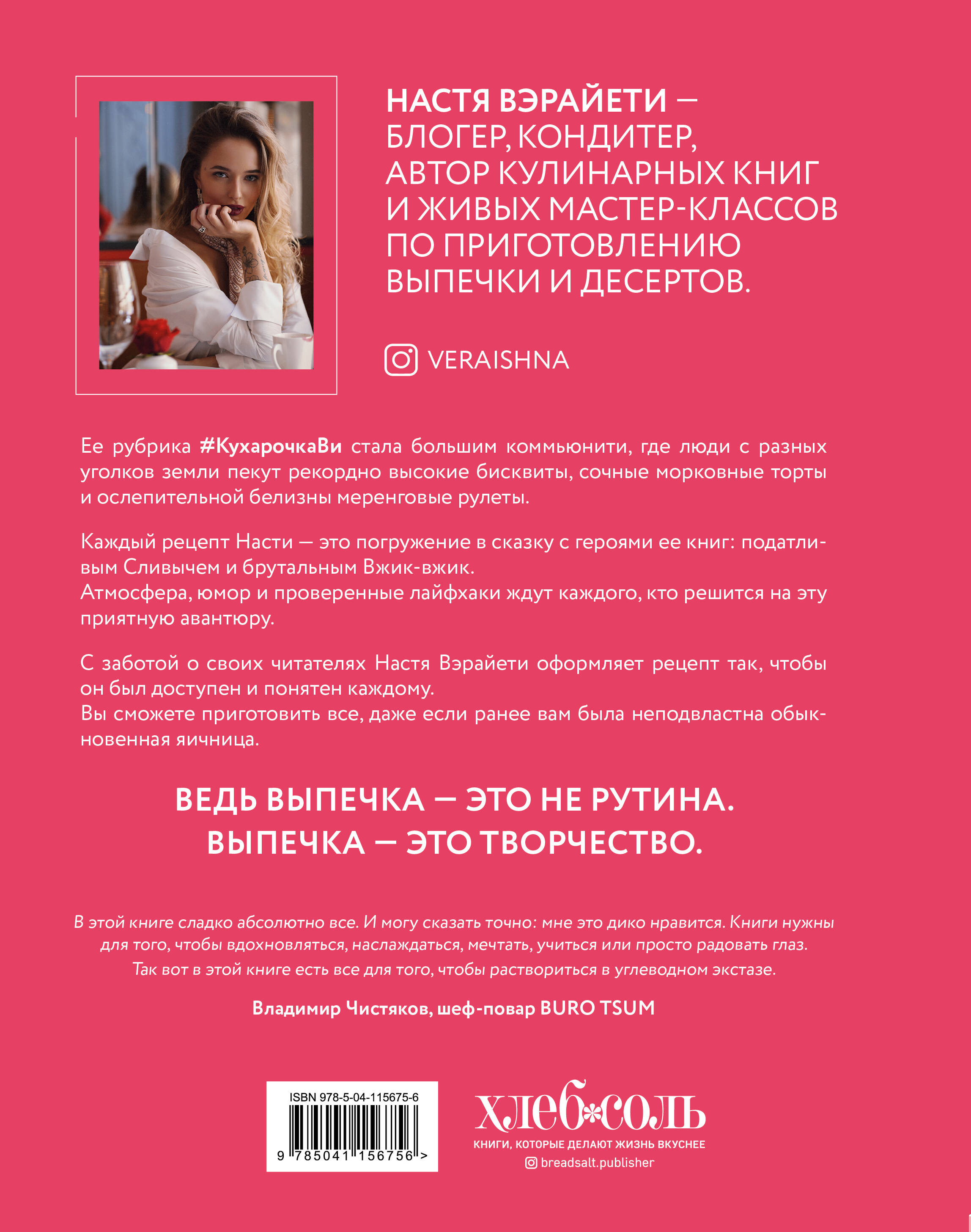 Все еще не умеете, но хотите научиться готовить идеальные десерты? И по-прежнему не знаете, с чего начать? Кухарочка Ви подскажет. Вторая книга фуд-блогера Насти Вэрайети - мануал для тех, кто не умеет печь. Вам нужно только точно следовать рецептам, шаг за шагом идти по инструкции, и результат может изменить как вашу жизнь, так и жизнь тех, кому повезло быть в вашем ближнем круге. В книге вы найдете: - Три шага к идеальной выпечке. С чего начать? - 50 рецептов, от чизкейков до панкейков. - Полезные суперлегкие завтраки и снэки. - Подробные инструкции по приготовлению каждого рецепта.| Издательство | ООО "Издательство "Эксмо" |