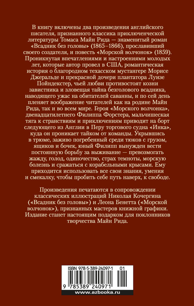 В книгу включены два произведения английского писателя, признанного классика приключенческой литературы Томаса Майн Рида - знаменитый роман "Всадник без головы" (1865-1866), прославивший своего создателя, и повесть "Морской волчонок" (1859). Проникнутая впечатлениями и настроениями молодых лет, которые автор провел в США, романтическая история о благородном техасском мустангере Морисе Джеральде и прекрасной дочери плантатора Луизе Пойндекстер, чьей любви противостоят козни завистника и зловещая тайна безголового всадника, наводящего ужас на обитателей саванны, и по сей день пленяет воображение читателей как на родине Майн Рида, так и во всем мире. Героя "Морского волчонка", двенадцатилетнего Филиппа Форстера, мальчишеская тяга к странствиям и приключениям приводит на борт следующего из Англии в Перу торгового судна "Инка", куда он проникает тайком от команды. Укрывшись в трюме, заживо погребенный среди тюков с грузом, ящиков и бочек, юный Филипп вынужден вести постоянную борьбу за выживание - превозмогать жажду, голод, одиночество, страх темноты, морскую болезнь и сражаться с корабельными крысами. Ему приходится использовать все свои знания, умения и смекалку, чтобы пробить себе путь наверх, к свободе. Произведения печатаются в сопровождении классических иллюстраций Николая Кочергина ("Всадник без головы") и Леона Бенетта ("Морской волчонок").| Издательство | Азбука-Аттикус Издат.группа ООО |